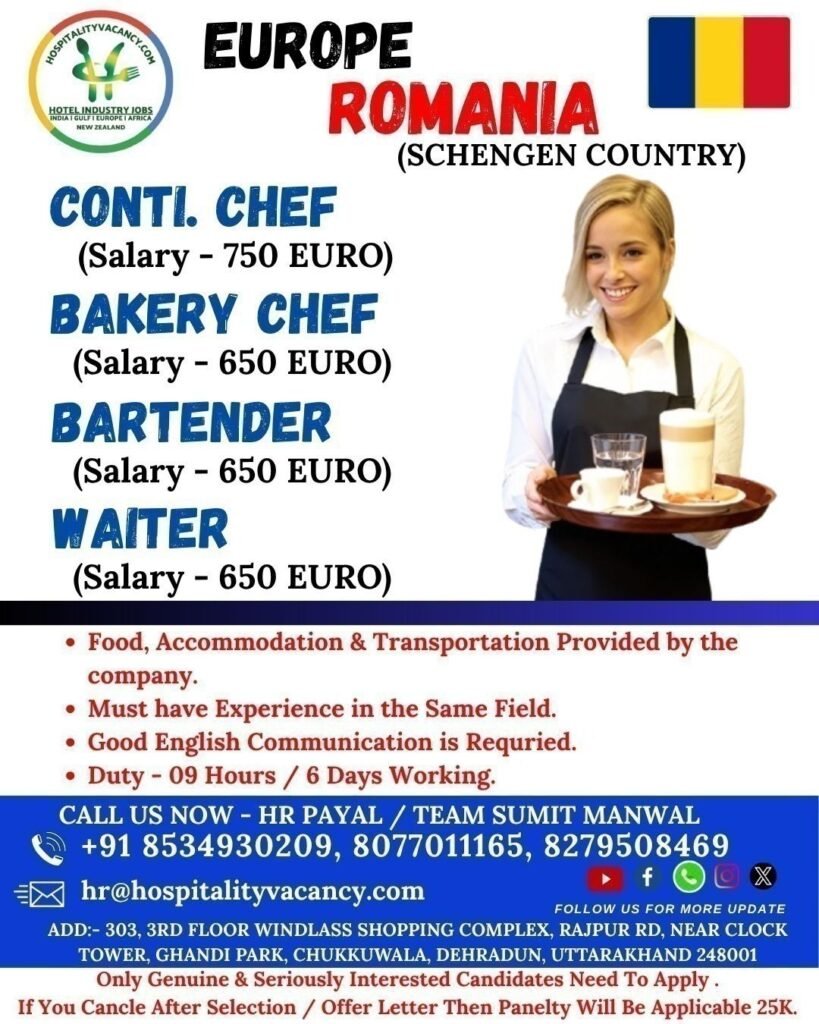 Europe | Romania | Hospitality Jobs NaukriVidesh 25/08/2025 Bartender, Continental Chef, Europe, Hospitality, Romania, Waiter 0 Comments Europe | Romania | Hospitality Jobs Europe, Romania, Hospitality, Jobs, Chef, Bartender, Waiter, Share this post Facebook Twitter LinkedIn Pinterest BartenderChefEuropeHospitalityJobsRomaniaWaiter Post navigation Previous PostQatar | Electrical TechnicianNext PostSaudi Arabia Jobs | Burger Maker Leave a Comment Cancel reply Your Name Your Email Save my name, email, and website in this browser for the next time I comment. Your Comment Recent News Articles Fresh job related news content posted each day. 25/08/2025 Arabic Chef 0 Comments Europe | Slovenia | Butcher Jobs Europe | Slovenia | Butcher Jobs | Hospitality Vacancy Read More 25/08/2025 Burger Maker 0 Comments Saudi Arabia Jobs | Burger Maker Saudi Arabia Jobs | Burger Maker | Fast Food Chef | American Cuisine Read More 09/08/2025 Europe 0 Comments Europe Malta Jobs Read More