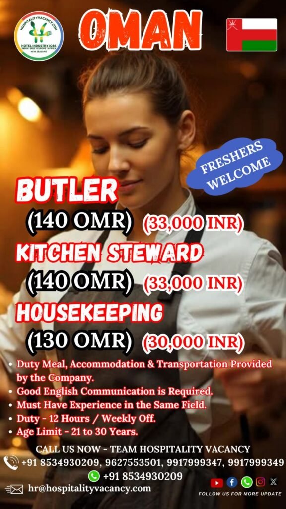 Oman Jobs| Butler | kitchen steward | housekeeping | hospitalityvacancy.com Sumit Manwal March 6, 2026 Butler, Housekeeping, Kitchen Steward, Oman 0 Comments Oman | Butler | kitchen steward | housekeeping Hospitalityvacancy.com Oman | Butler | kitchen steward | housekeeping Share this post Facebook LinkedIn Pinterest abroad jobs for indiansgulf jobsGulf jobs for Indian freshersGulf Jobs for IndiansOman | Butler | kitchen steward | housekeeping Post navigation Previous PostEurope | Slovenia | Butcher Jobs Leave a Comment Cancel reply Your Name Your Email Save my name, email, and website in this browser for the next time I comment. Your Comment